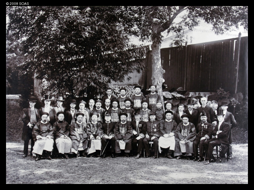 No caption in the album for this photograph of a large group of Chinese and foreign men, finely dressed or in senior military uniform, posed in a garden. Probably late 19th century. Definitely VIPs, could be a Mandarin and consuls?