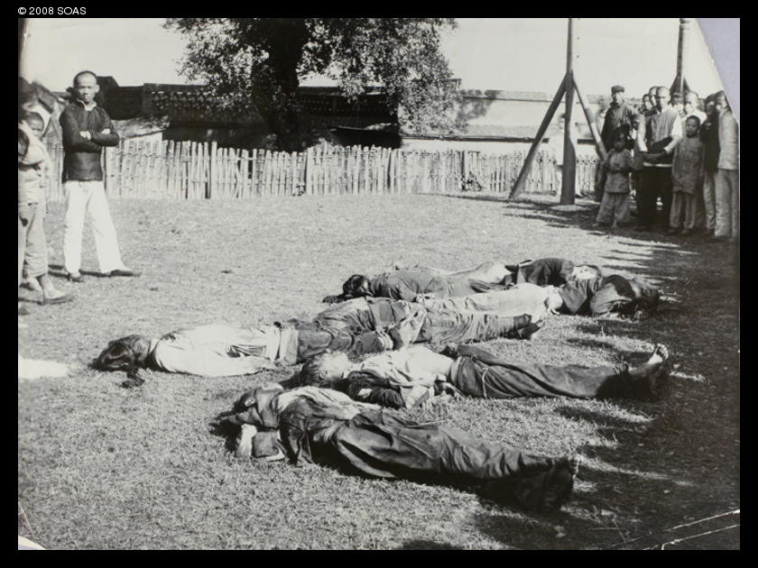 No caption on the back of this lose print. Six corpses on the ground, with lookers on. Perhaps executed criminals?