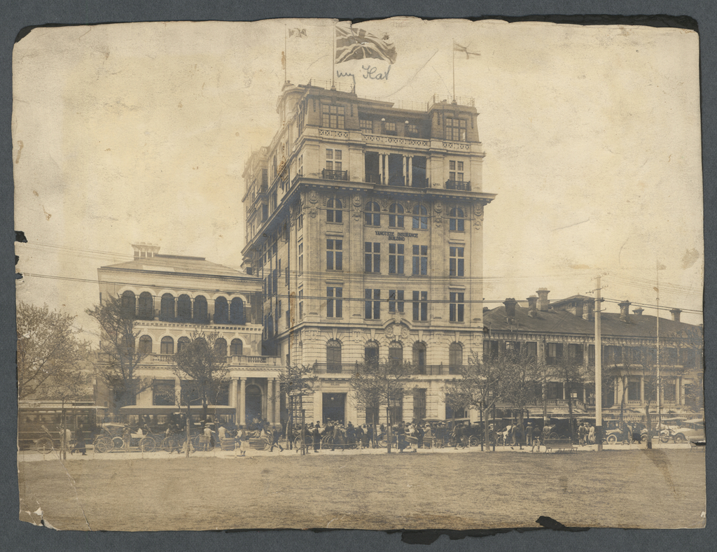 Information data : Two other buildings are visible on the picture: on the right-hand side, the Jardine Matheson & Co. building (before its reconstruction in 1920); on the left-hand side, the P. & O. S.N. building.