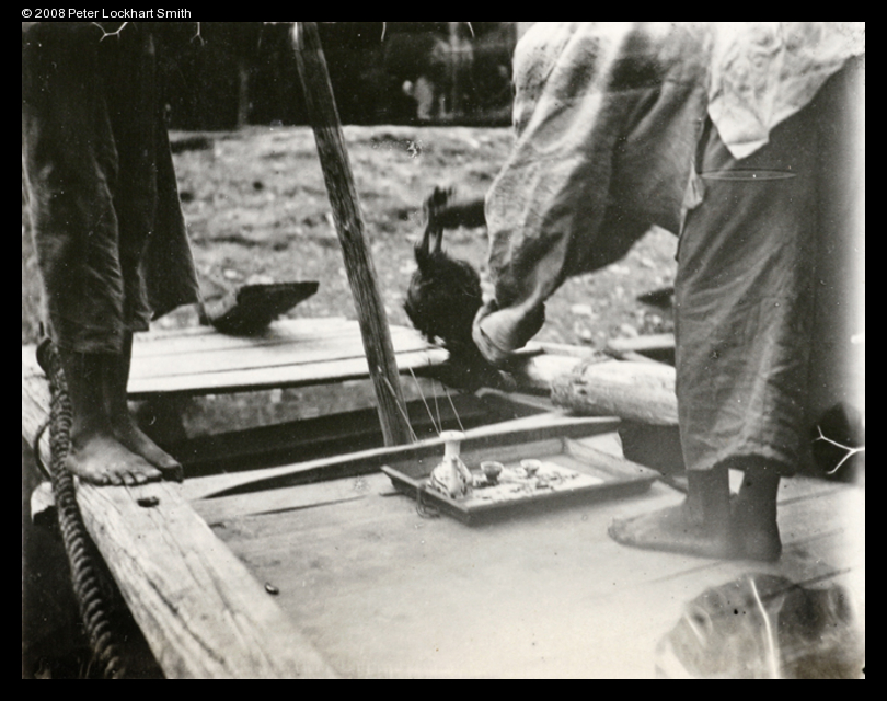 A small alter is set up in the prow of the boat, with sticks of incense. After the sacrifice, a few feathers are stuck with blood upon the boat. The safety of the voyage thus guaranteed, the chicken is eaten by the crew by way of celebration.