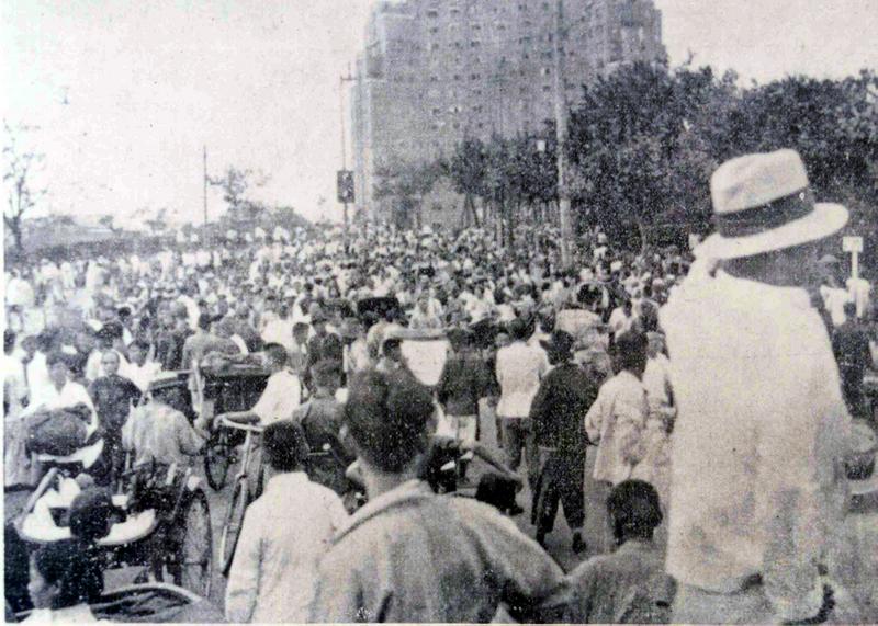 Information data : The crowd of refugees is flooding into the International Settlement along Seward road. On the foreground the Broadway Mansion and Garden Bridge.