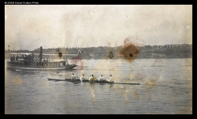 Title : Rowing behind a launch, with race spectators