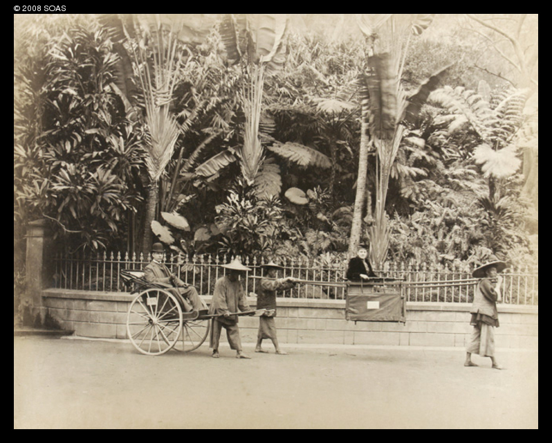 Rickshaw and sedan chair outside Botanical Gardens, Hong Kong