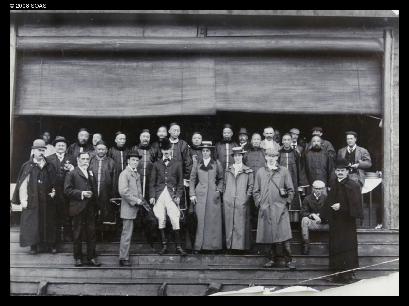 No caption in the album for this picture of a group of Chinese men, with some Europeans, including a man in riding or hunting gear, outside the same building as in Os02-014.