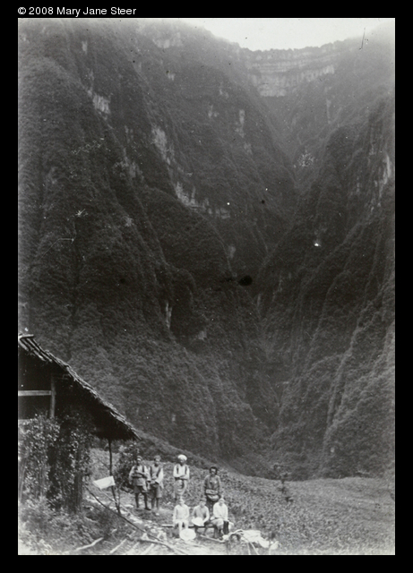 Caption on support : 1921 The precipice of Mount Omei (?Gwan-chen) with Dare, Evans, and Betsy in the foreground, separated from it by a ravine.