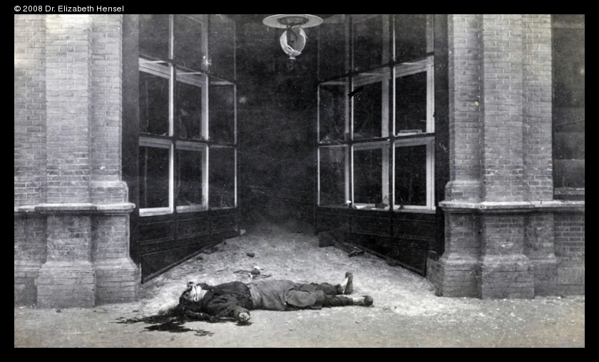 Apparently, this is the body of one of the rioters, with his head shot away, left as a warning to others all day, and then removed at night.