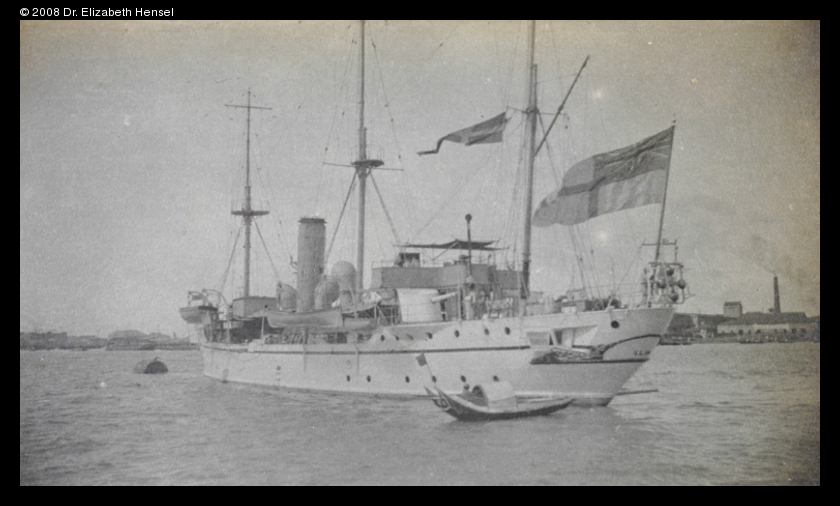 A steamer (gun boat?) flying the White Ensign (British Navy flag), perhaps on the Huangpu River in Shanghai?