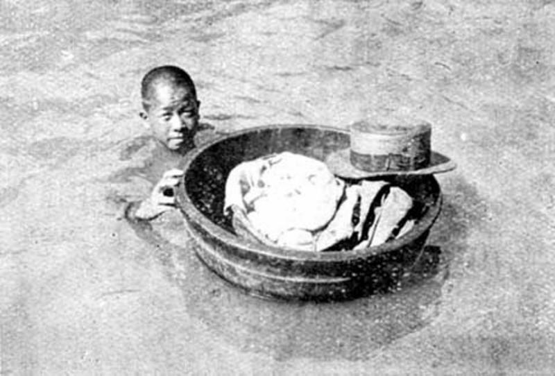 Information data : A food-peddler carries his wooden pot in the floodwater. He was caught while hawking along the street.