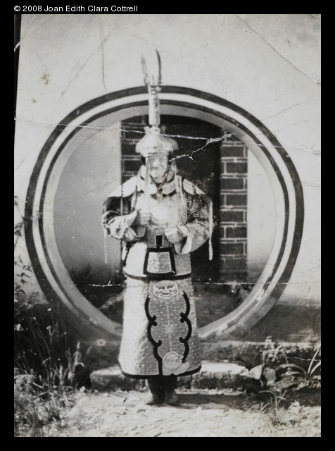 Caption on support : F.W.J.C. in Chinese armour. Only remnant of kingfisher feathers in Chinese chest.