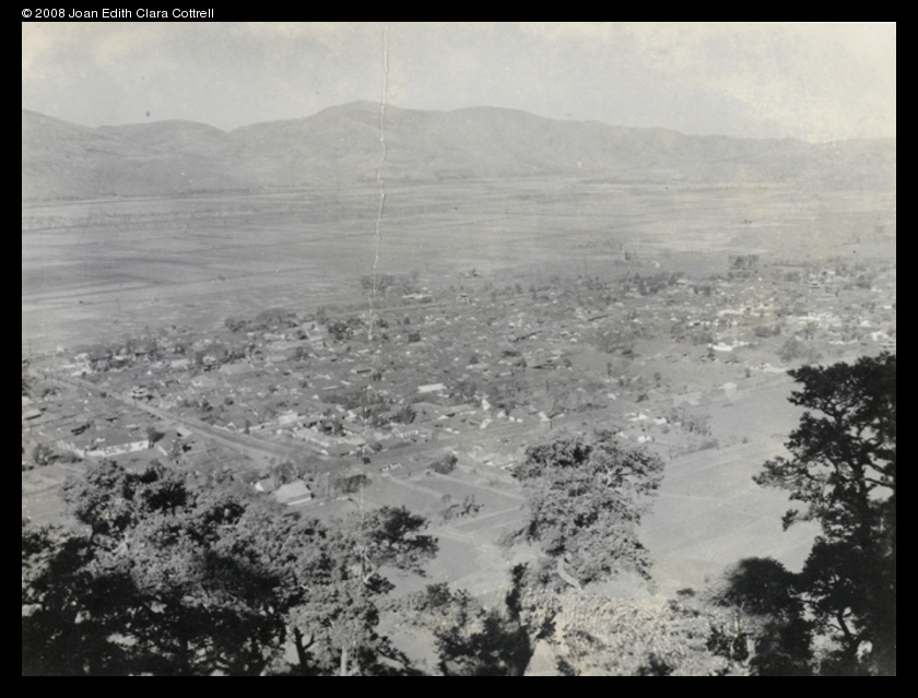 Caption on support : Tungshwan. Our compound is on the other side of this. The white roof is the church. Isn’t this lovely? It was taken from the ‘Hill of the Golden Bell’, marked ^ on the other photo. // Tungchuan City. Taken from the mountains behind.