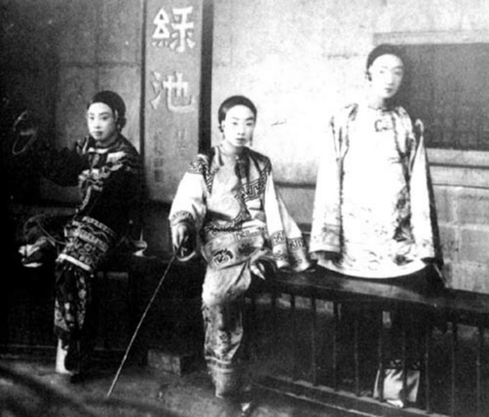 Information data : Three Chinese ladies with footbinding dress up. The clothes seem suggest an outside tour.