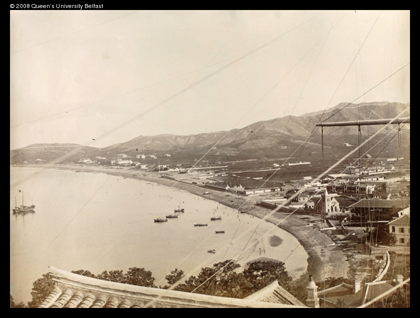 The signal station's stays can be seen in the foreground. The view is of the beach with the Chefoo schools in the distance.