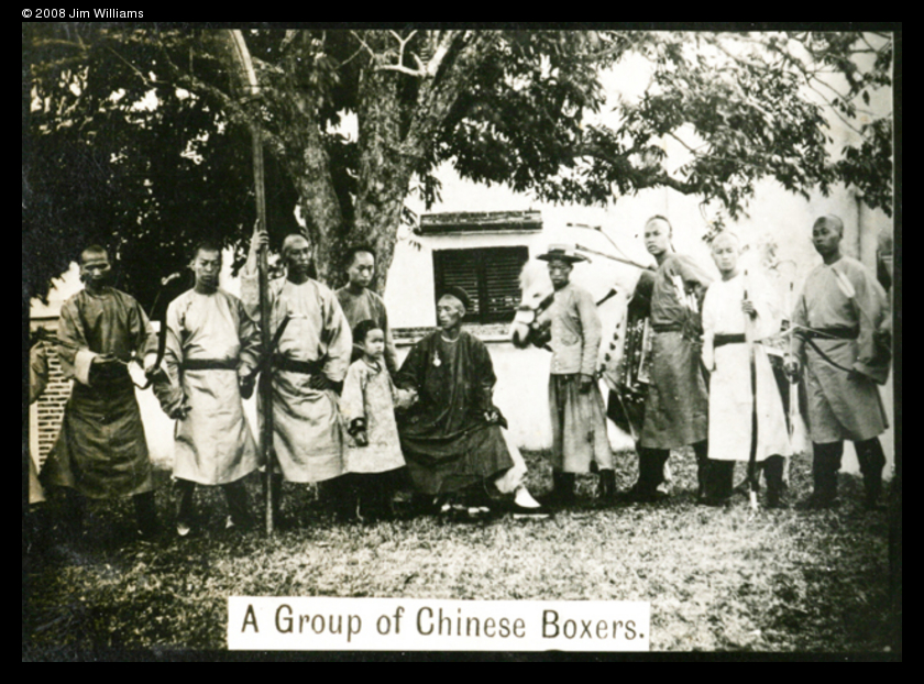 This image is from a cigarette card ('Ogden's Guinea Gold Cigarettes') made with photographic paper. Cigarette cards were supplied free in a packet of cigarettes. The caption is fanciful -- these are armed men, but they are not Boxers, and the photograph is much earlier than 1900.