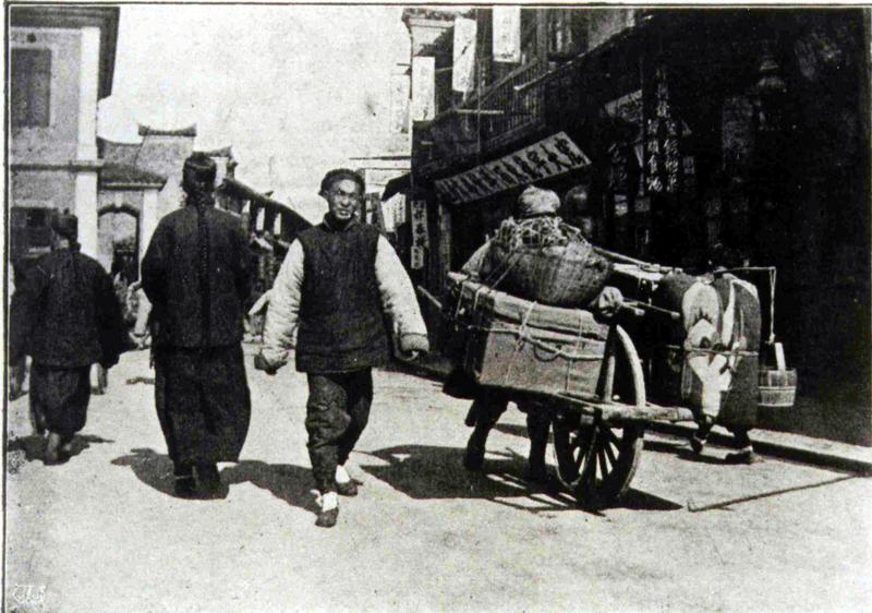 Information data : The pushcacrt is a one-wheel cart pushed by a man. It can carry either people or goods on its side shelves.