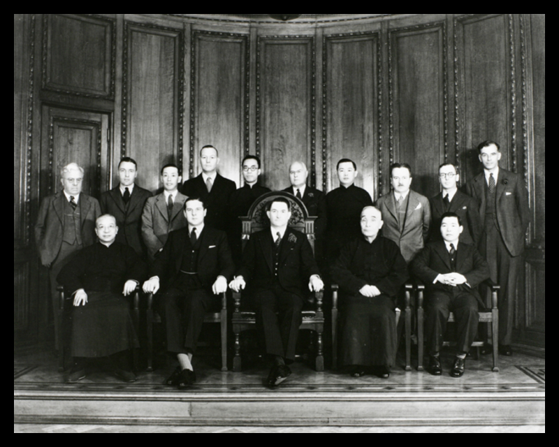 Caption on support : Council members, 1939. Chairman C.S. Franklin (c., on Chairman's carved chair). On his right Vice-Chairman W.J. (Tony) Keswick (Jardine, Matheson). Third from right, f. row, Yu Yah-ching (Yu Xiaqing).