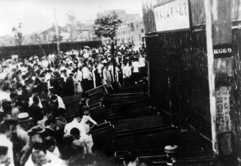 Information data : A crowd of people observe the corpses lying in the lines of coffins to identify them.