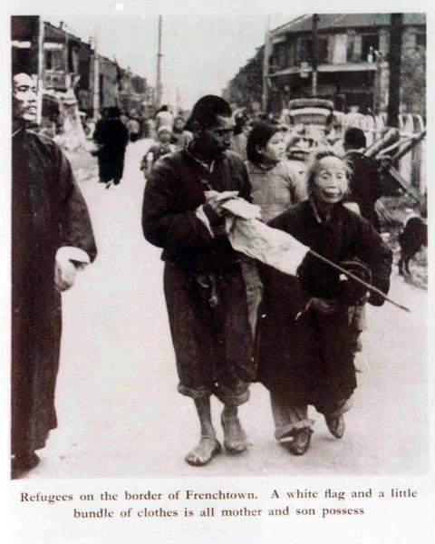 Caption on support : Refugees on the border of the Frenchtown. A white flag and a lttle bundle of clothes is all mother and son possess