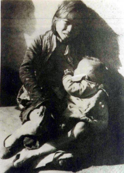 Title : Refugee mother feeding her baby in the street
