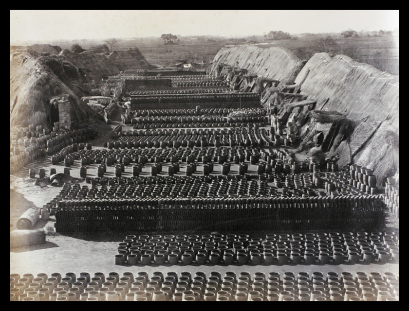 The caption in the album (45. H.B.M. Gunboat Lieven) is not correct. Bo02-049 is a photo of many large pots, probably freshly made at a pottery by a clayfield.