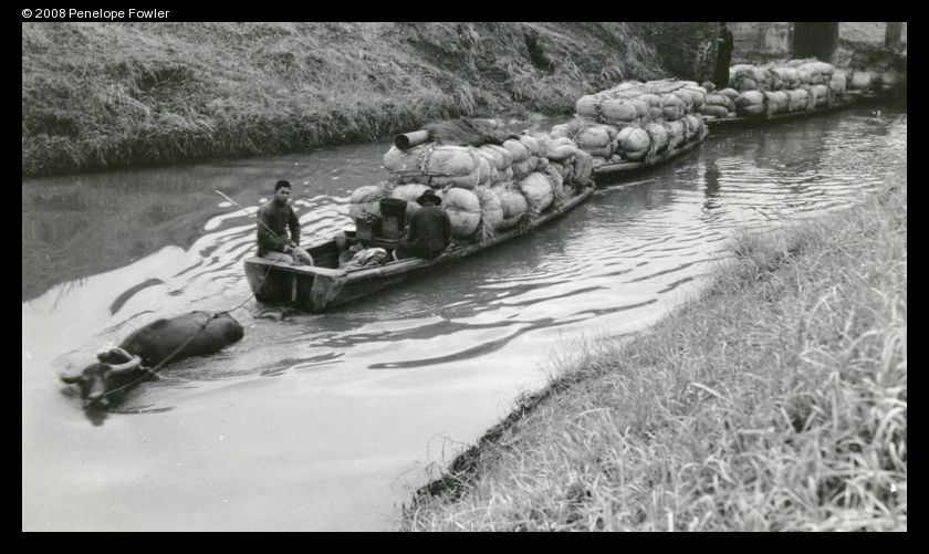Barges towed by a water buffalo