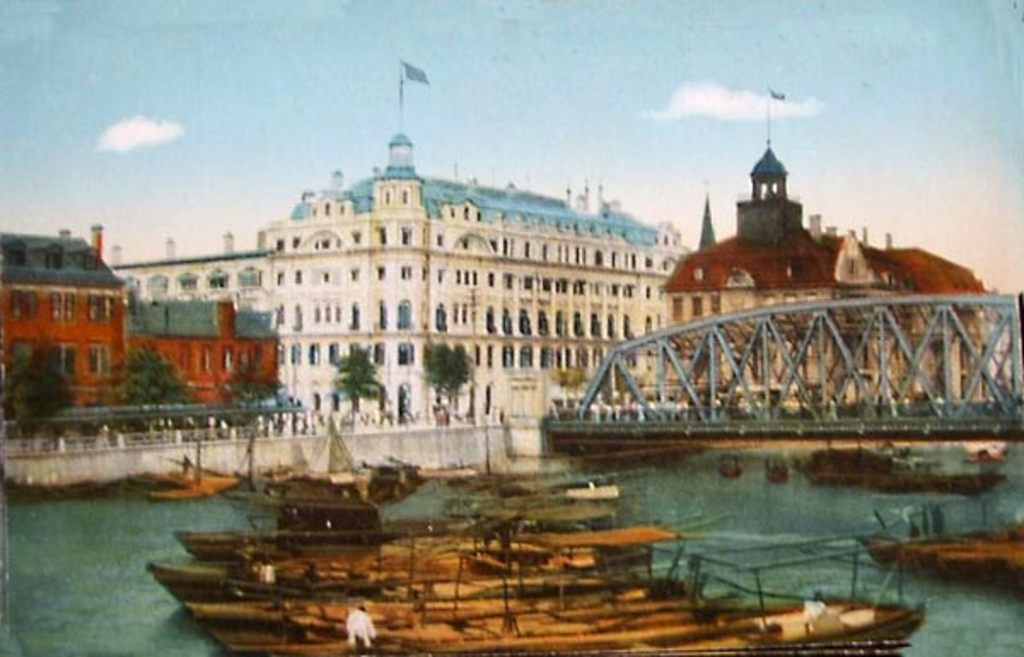 Keywords : building;bridge;consulate;hotel;Astor Hotel;Garden Bridge;Soochow Creek;river;boats;ships;flag
