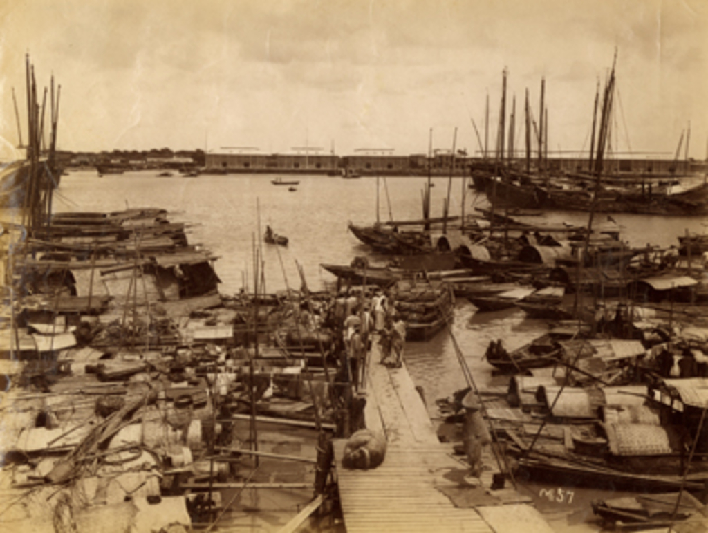 Caption on support : French Concession: From the opposite shore (Pudong), harbour with godowns (Shanghai)