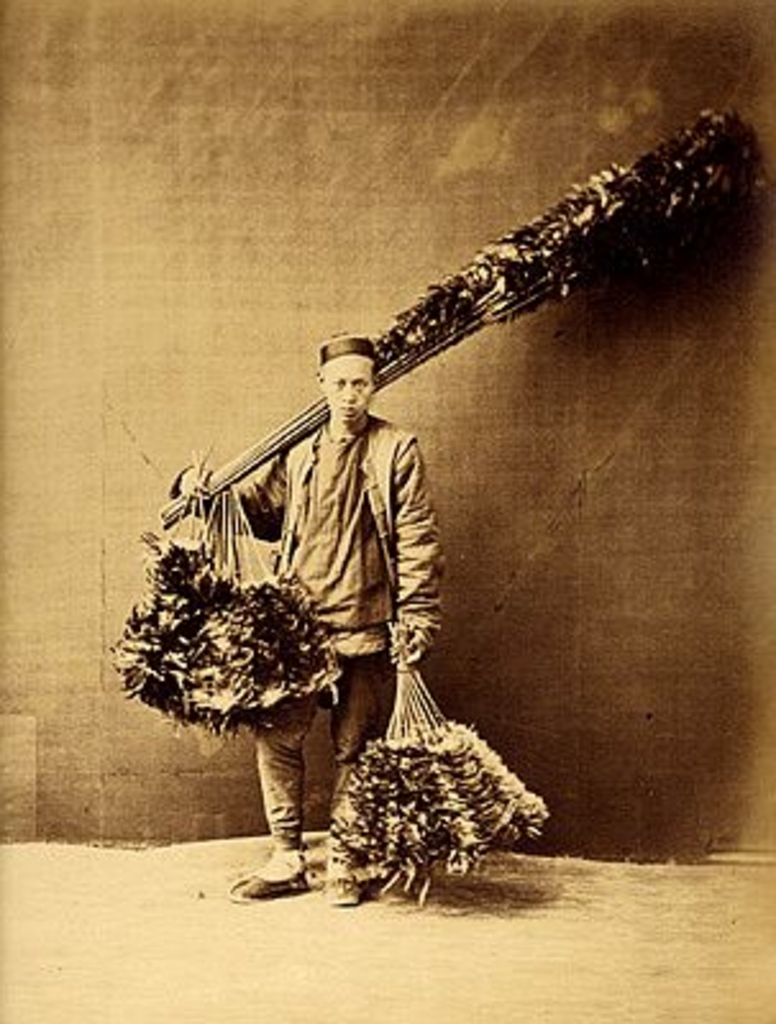Caption on support : Studio portrait of a chicken feather duster vendor. [Shanghai]