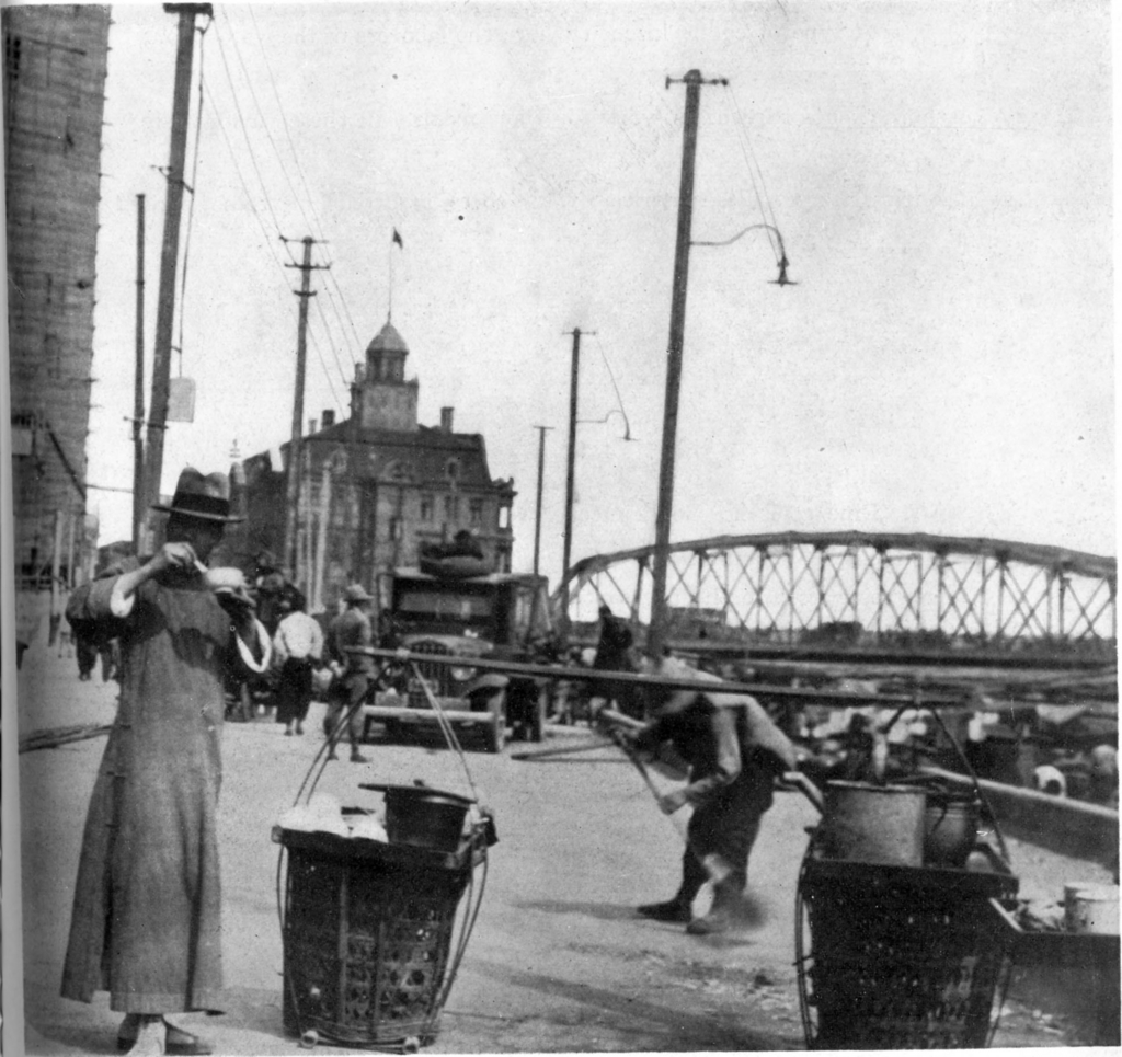Keywords : food;peddler;customer;basket;bamboo pole;Garden Bridge;bridge;consulate;car;dress;clothing;broom;coolie;river