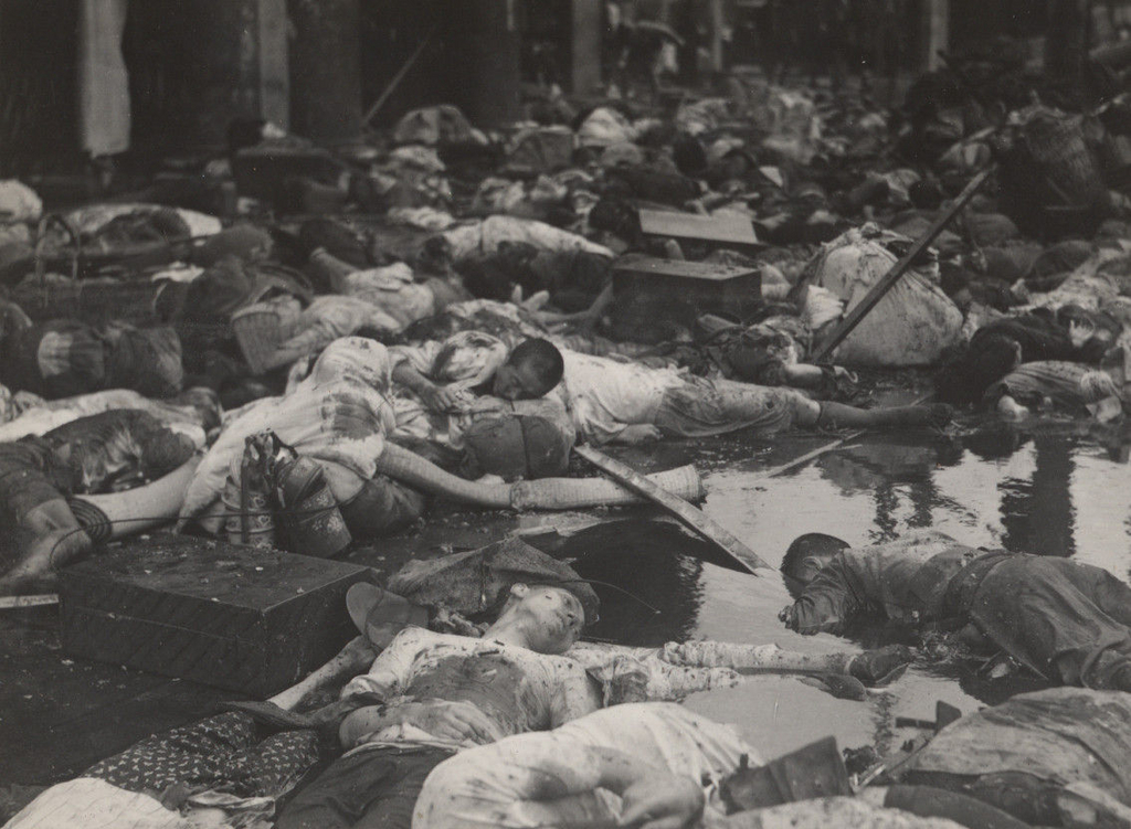 Information data : This picture shows the corpses of the civilians, many of them refugees from the war-torn northern districts, after the accidental bombing at the junction of Thibet Road and boulevard de Montigny, near the Great World amusement center.
