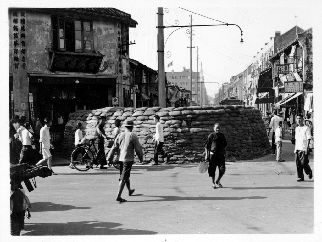 Keywords : war;defense;sandbag;shop;shop sign;pedestrian;bicycle;flag;clothing;dress