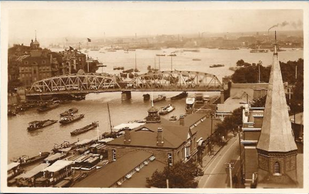 Keywords : bridge;Garden Bridge;consulate;Russian consulate;church;roof;Rowing Club;boat;ship;river;Soochow Creek;Huangpu River
