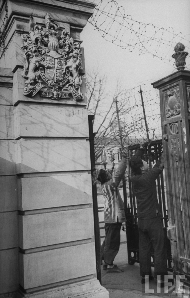 Caption on support : Men stringing barbed wire around British Consulate.
