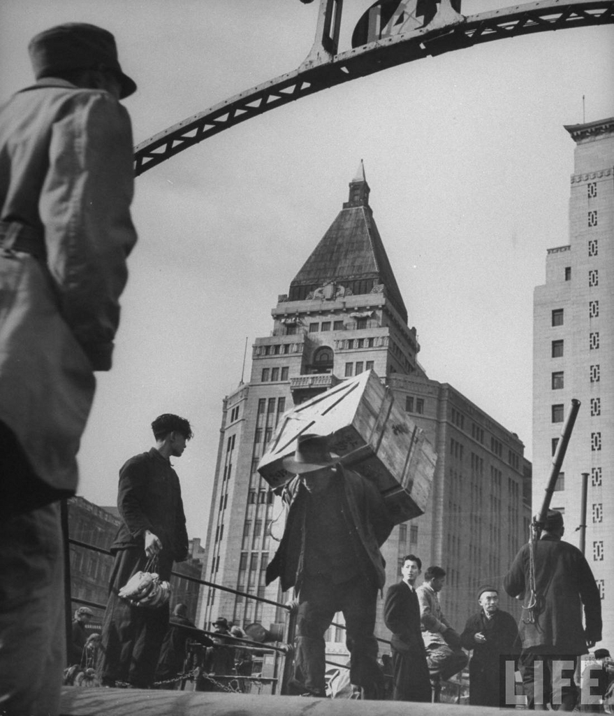 Keywords : building;wharf;worker;coolie;Sassoon House;Cathay Hotel;peddler