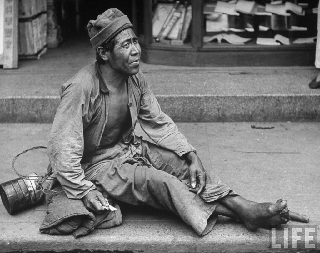 Caption on support : Beggar sitting on sidewalk