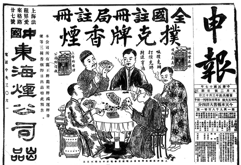 Keywords : Shenbao; 1928; male; cigarettes; advertisement; men playing poker; chinese dress; table.
