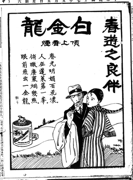 Keywords : Shenbao; 1928; female/male; cigarettes; advertisement; "Golden Dragon"; "western" dresses; landscape; hills; promenade; couple.