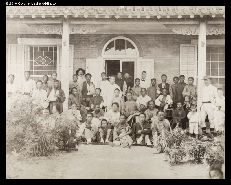 Caption on support : Convalescent wounded Chinese treated to tea & cigars by Mr Buck, English merchant, during occupation of the Chinese. Newchwang. June 1895.