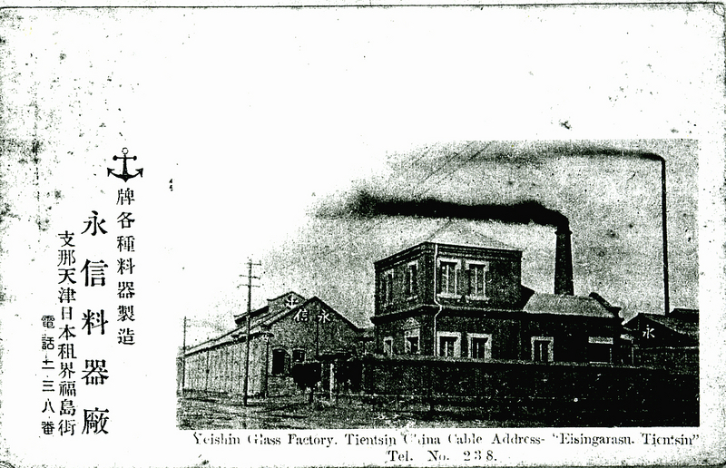 Caption on print : Yeishin Glass Factory. Tientsin China Cable Address- ‘Eisengarasu. Tientsin’