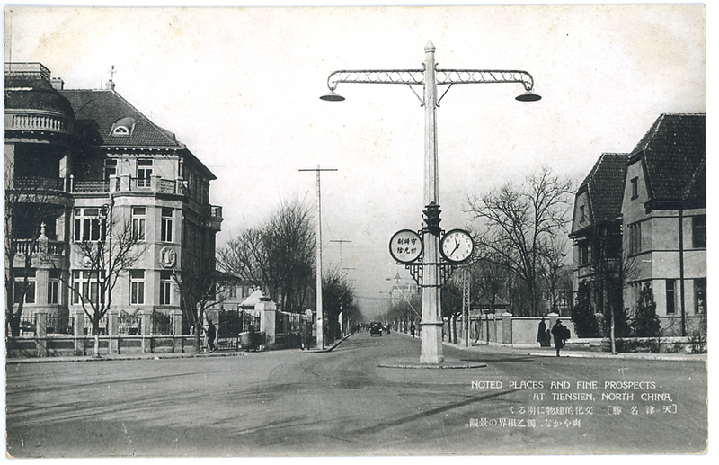 Title : Ex-German Concession: boulevard, traffic lights and clock on lamp-post, Tientsin