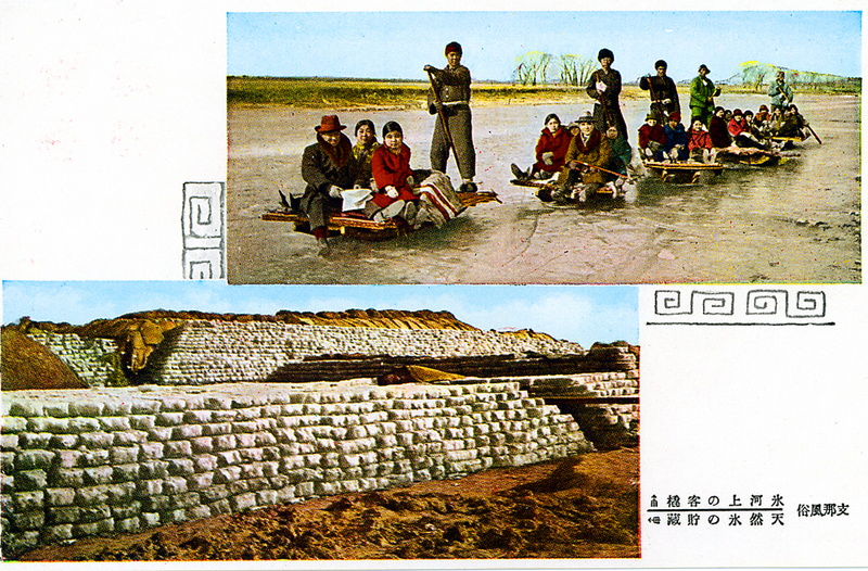 Sledges on a frozen waterway; storage of ice blocks