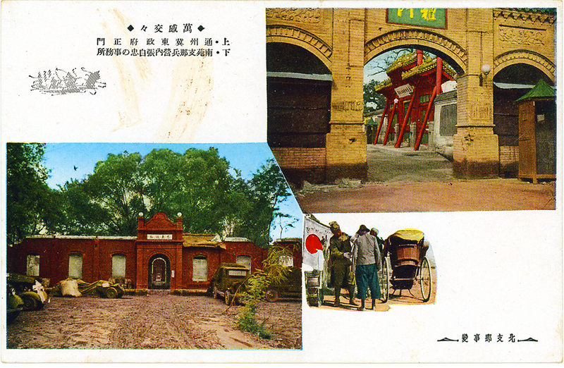 Japanese army vehicles; gate; Japanese soldiers searching civilians