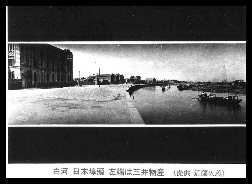 Translation of the Japanese caption on the photograph: Shirakawa, Nihon Wharf. Left: Mitsui & Co., Ltd.