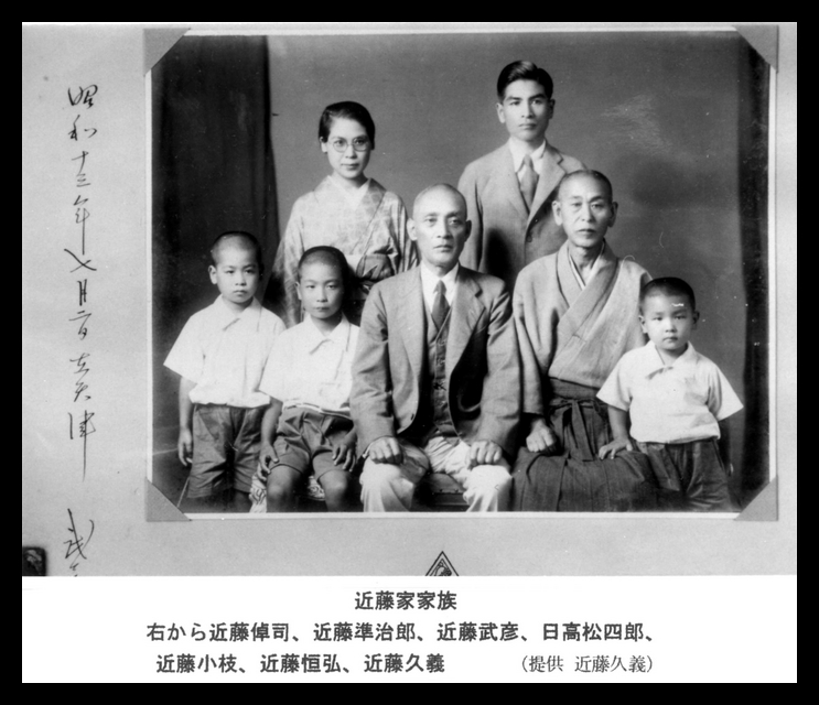Translation of the Japanese caption on the photograph: Kondo family. From right: Takushi Kondo, Junjiro Kondo, Takehiko Kondo, Matsushiro Hidaka, Koeda Kondo, Tsunehiro Kondo, Hisayoshi Kondo.