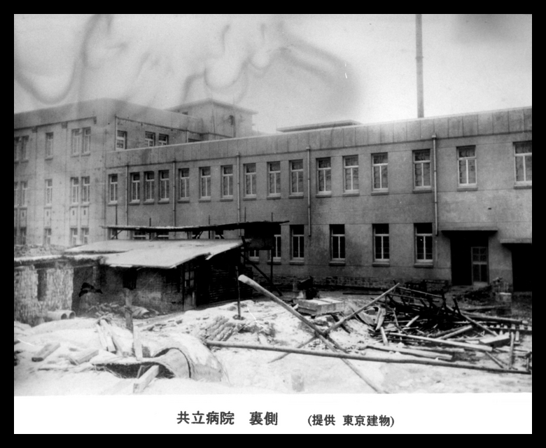 Translation of the Japanese caption on the photograph: Back of Kyoritsu Hospital.