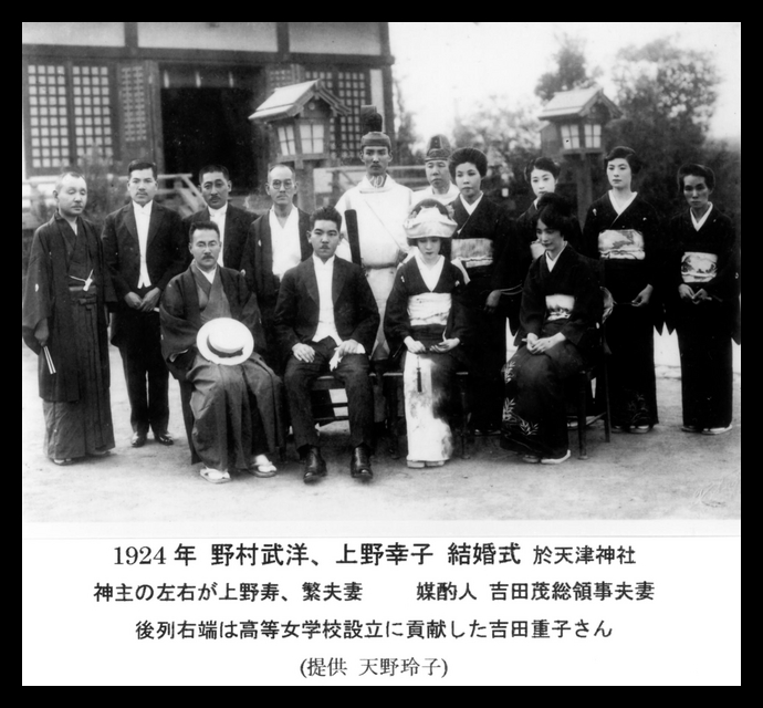 Translation of the Japanese caption on the photograph: Wedding Ceremony of Takehiro Nomura and Sachiko Ueno at Tientsin Shrine, 1924.