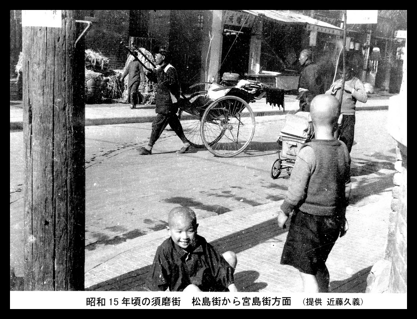 Translation of the Japanese caption on the photograph: Suma Street around Showa 15 (1940).