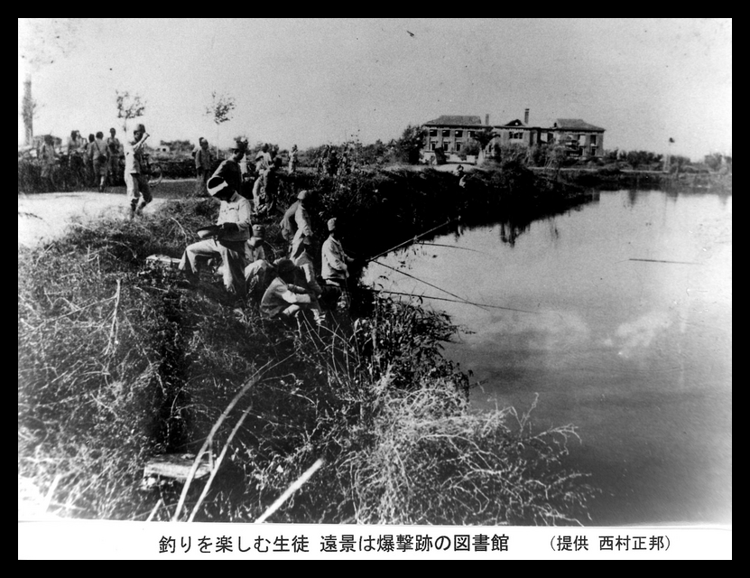 Translation of the Japanese caption on the photograph: Students enjoying fishing. In the distance: bomb-damaged library, Nankai University.