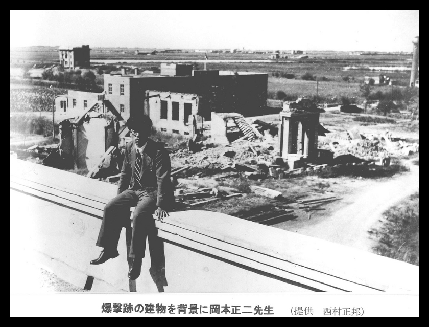 Translation of the Japanese caption on the photograph: Professor Shoji Okamoto with bombed buildings behind (Nankai University).