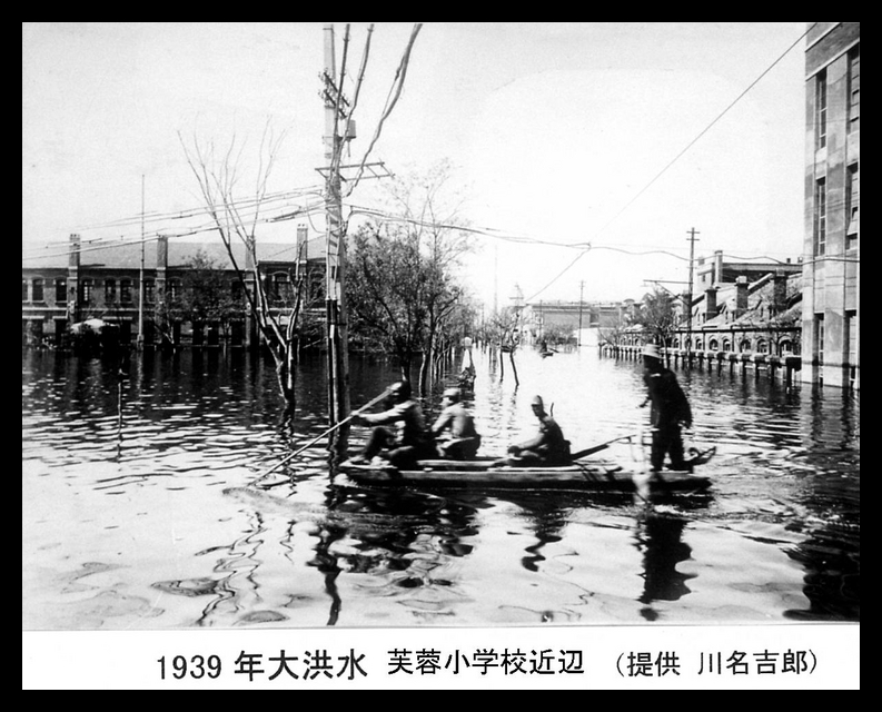 Translation of the Japanese caption on the photograph: 1939 Floods. Near Fuyo primary school.