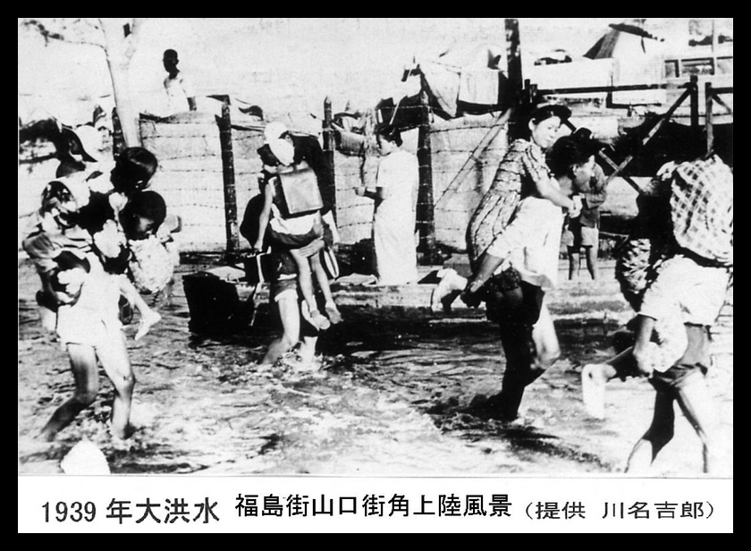 Translation of the Japanese caption on the photograph: 1939 Floods. People being carried to dry land, at the corner of Fukushima Street and Yamaguchi Street.